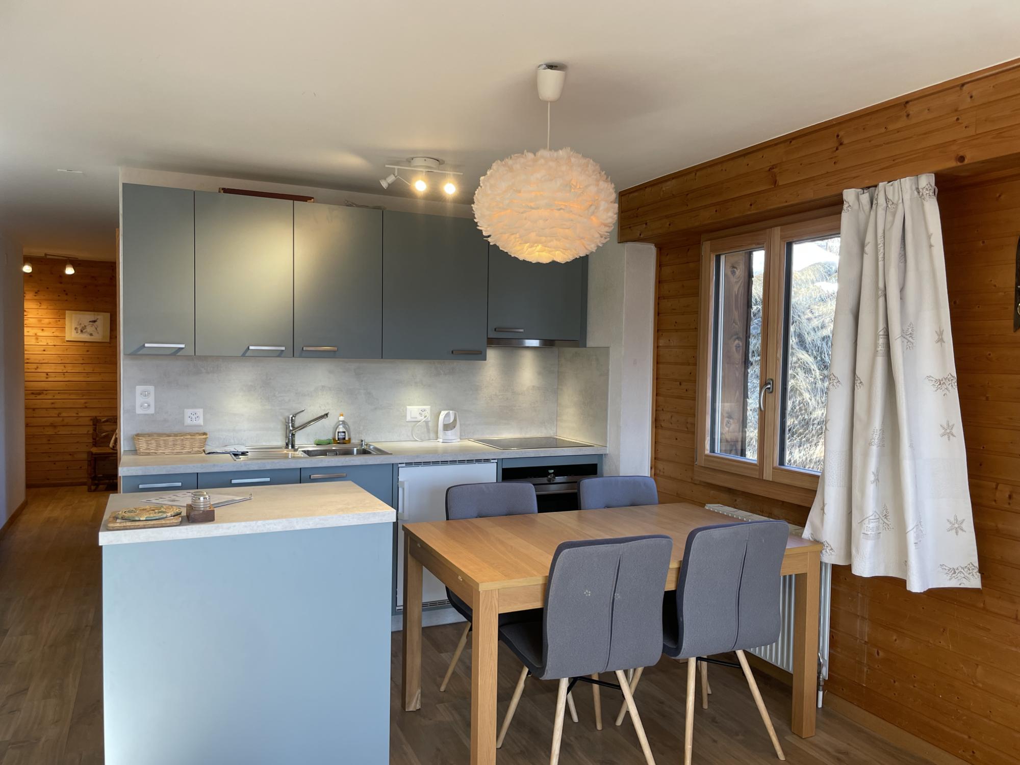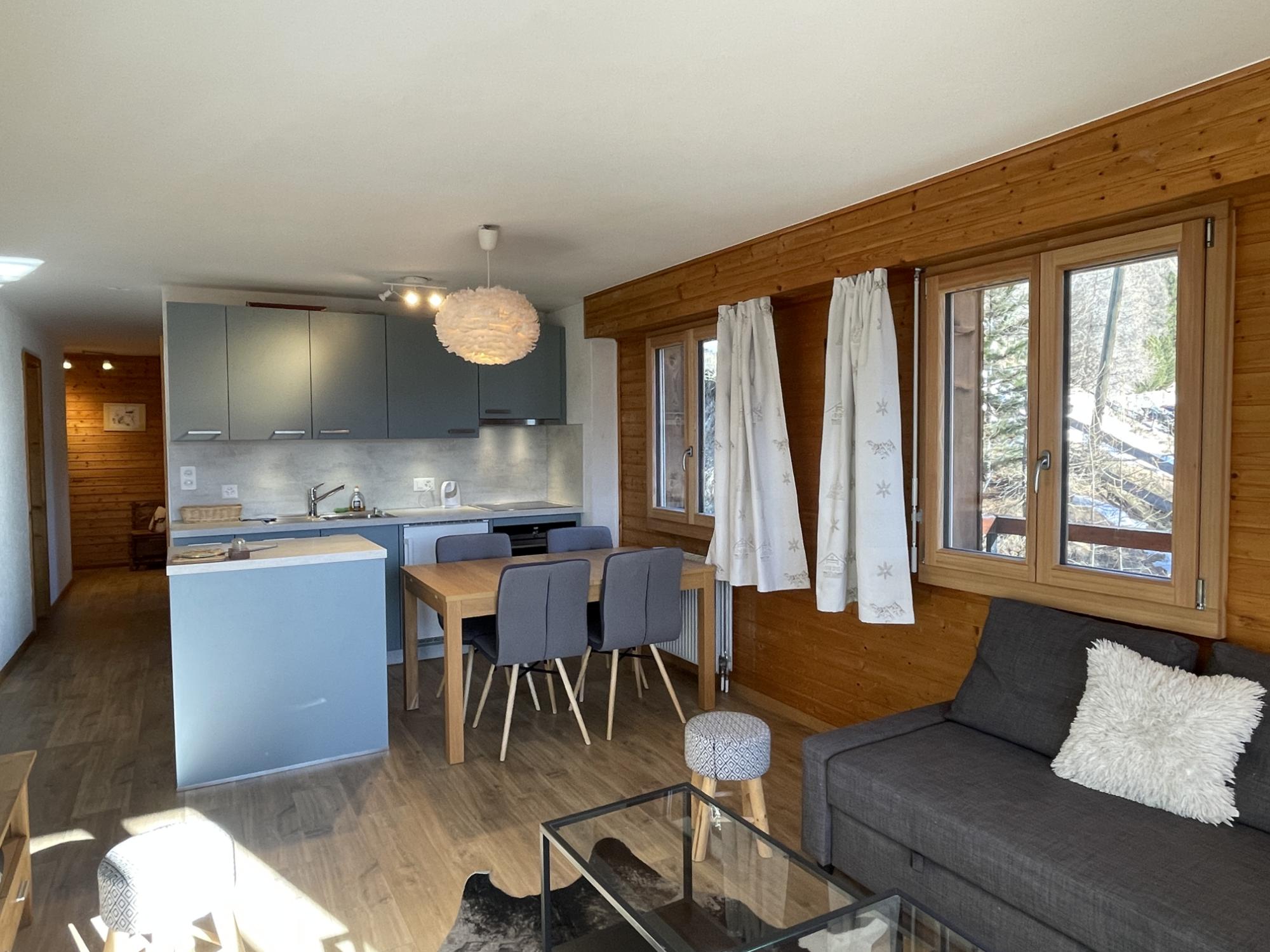 Appartement confortable comprenant une entrée, une salle de bains et des WC séparés. Cuisine ouverte sur l’espace repas avec table en bois et coin séjour avec canapé et cheminée (bois non inclus). Balcon avec belle vue.