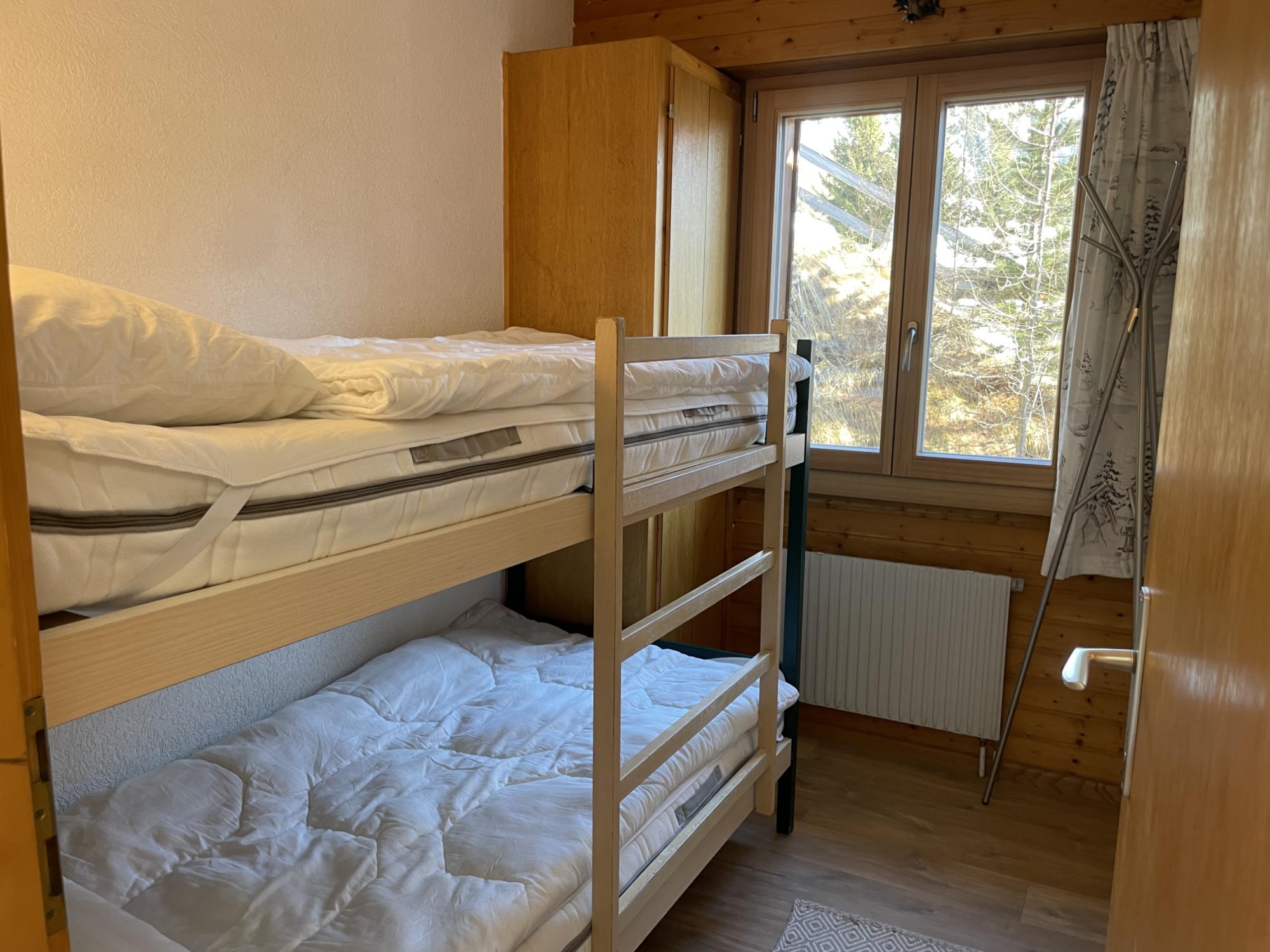 Deux chambres : une chambre avec lits superposés (2 couchages) et une chambre double avec lit de 140 cm.