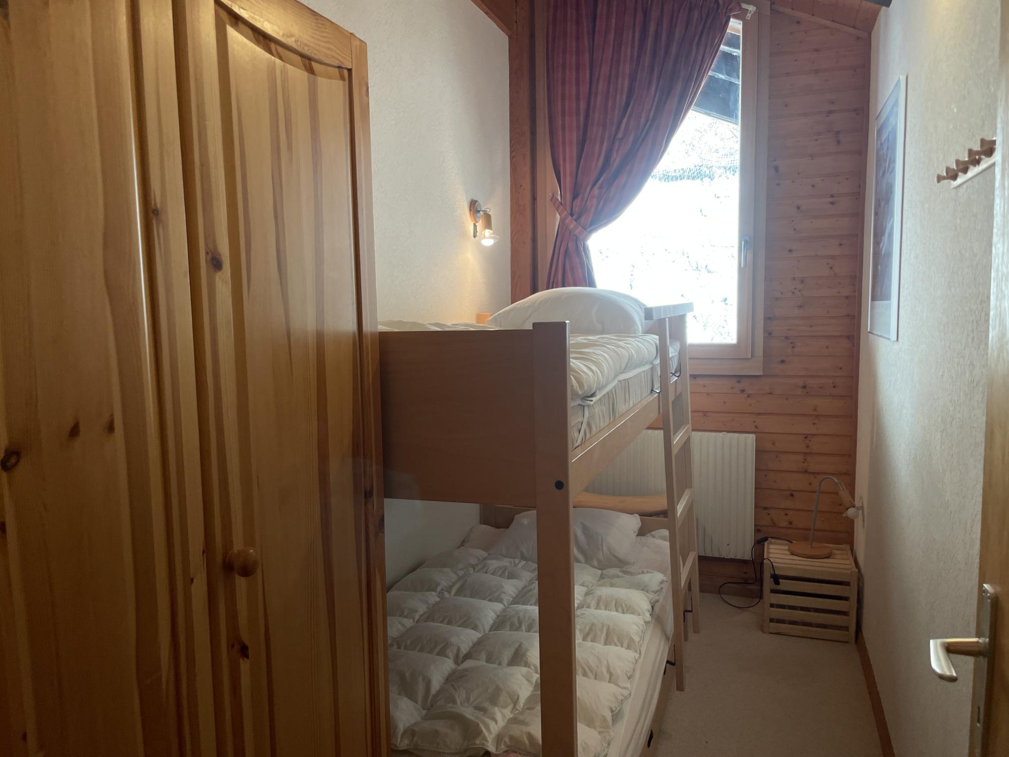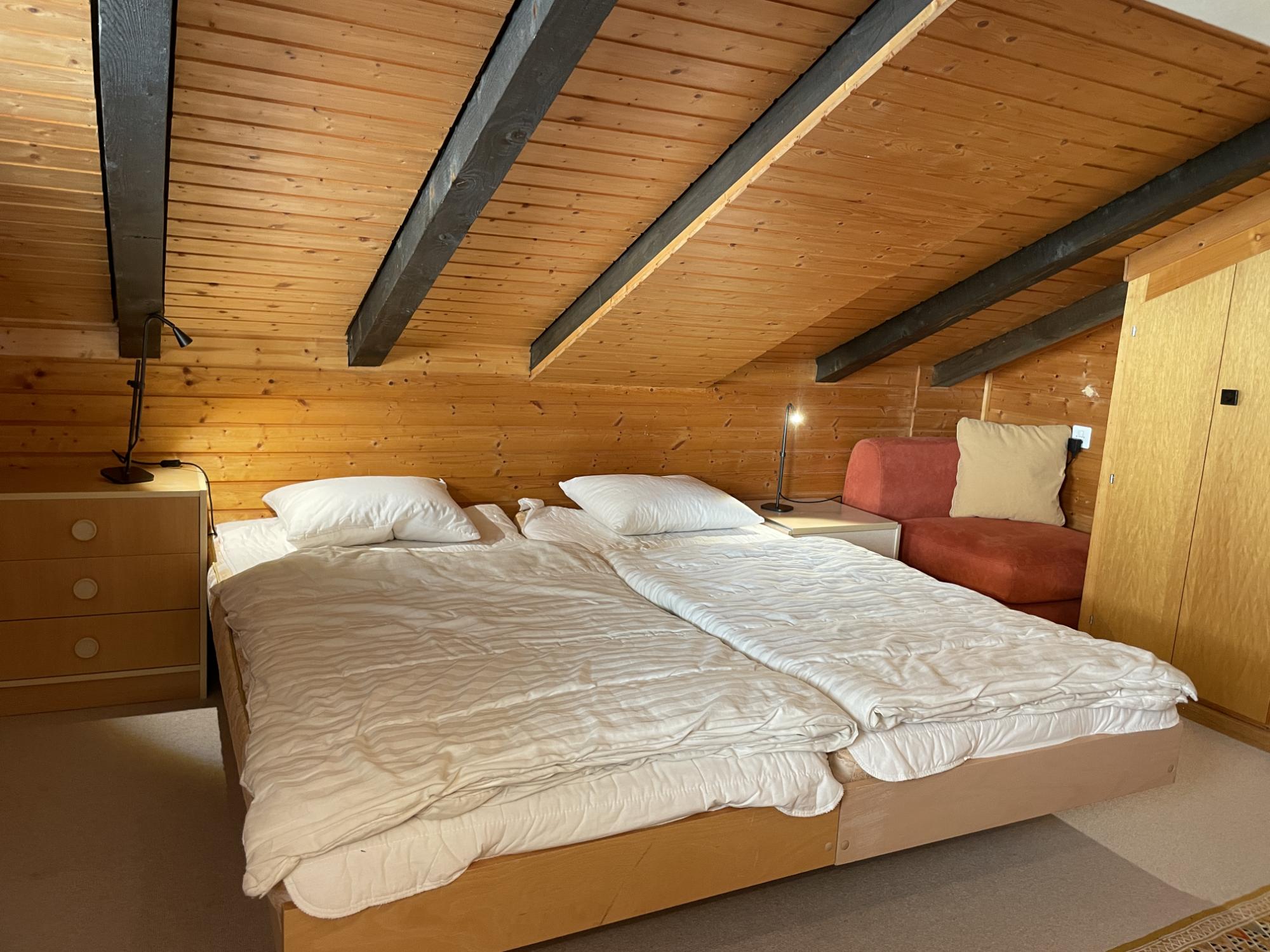 A l'étage supérieur : grande chambre double (deux lits simples côte à côte) avec bureau et douche attenante, une chambre double mansardée (deux lits simples côte à côte), une chambre pour 2 avec lits superposés, et une quatrième pièces, sous les combles (peu de hauteur) aménagée avec futon. Sur le même étage, une salle de bains et WC séparés.